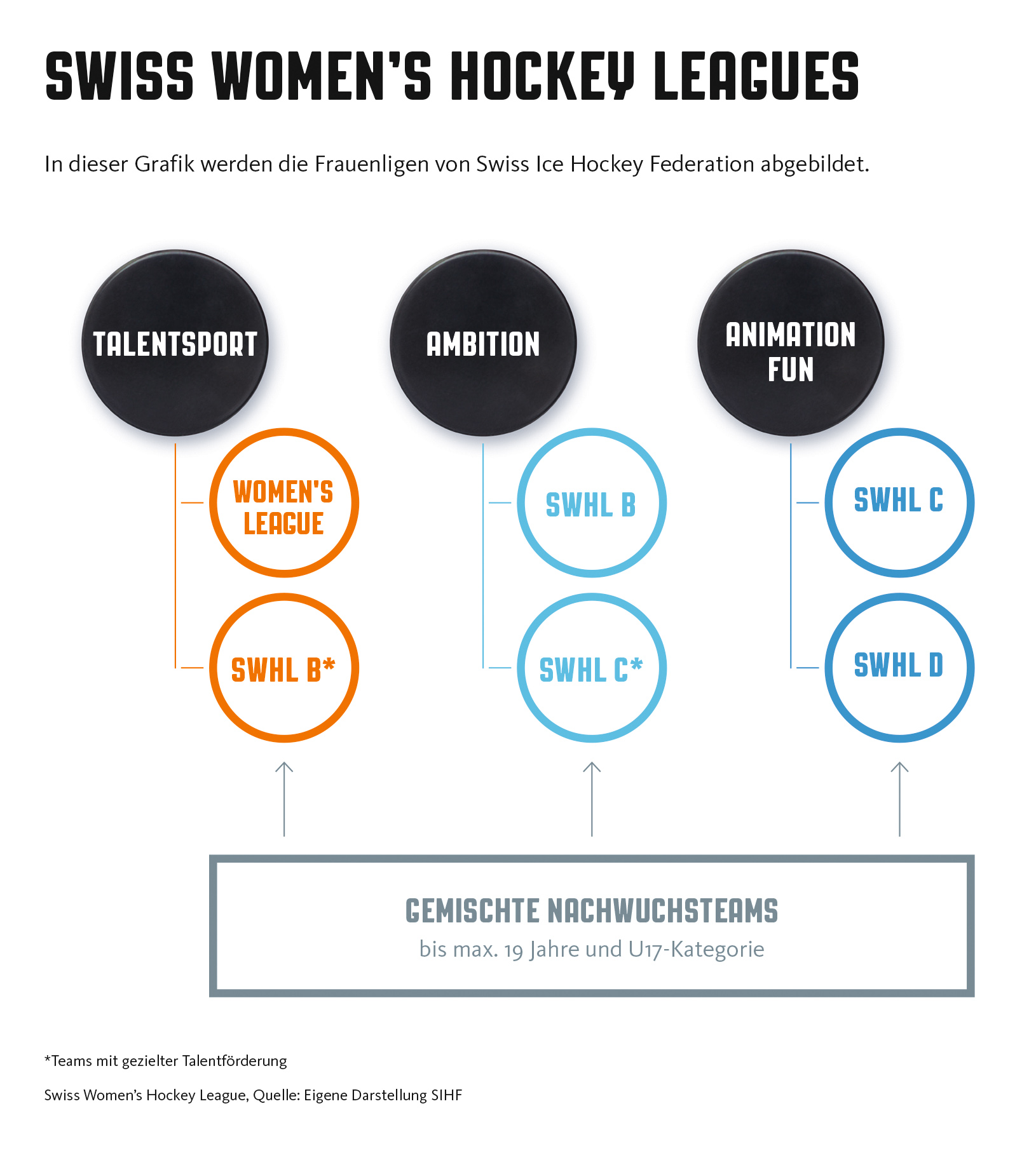 Ab 12 Jahren (Stufe U13) dürfen Mädchen in der Swiss Women’s Hockey League (SWHL) B, C und spielen. Eine Teilnahme am Spielbetrieb der höchsten Liga PostFinance Women’s League ist ab 15 Jahren möglich. Leistungsorientierte Mädchen finden in der PostFinance Women's League eine ideale Plattform, um im Club Eishockey auf höchster Stufe zu betreiben